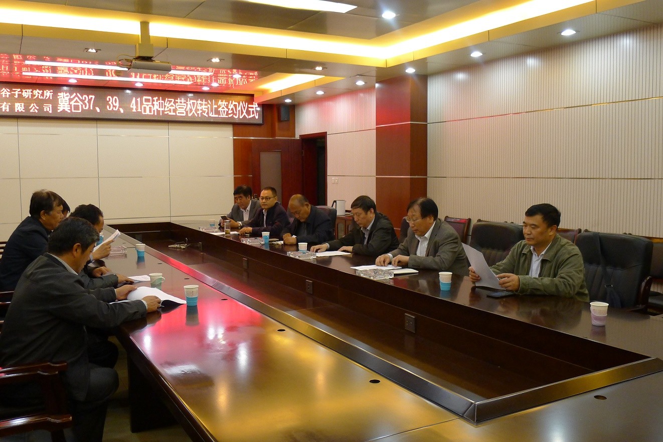 10月20日,我院谷子研究所与河北东昌种业有限公司关于冀谷37、冀谷39、冀谷41谷子品种经营权转让签约仪式在石家庄举行。我院王慧军院长、河北省种子管理总站张志刚站长、邯郸市农业局副局长赵天启、河北省种子协会冯五平副秘书长、邯郸市种子管理站王兆祥站长出席了签约仪式。签约仪式前,举办了谷子种业发展研讨会。谷子所程汝宏所长介绍了谷子所品种选育现状、与企业合作情况以及今后育种方向。王慧军院长深入分析了我国谷子产业发展历史、存在问题,指出了在当前农业供给侧改革、镰刀弯计划以及生态、营养健康需求增加的背景下,河北省谷子产业具有广阔前景。王院长对谷子所在谷子抗除草剂育种和成果转化方面取得的成绩给予了肯定,并对东昌种业与谷子所开展全面合作实现共赢的做法表示赞赏,希望两家单位深度合作,通过产学研结合共同促进产业发展,将小谷子做成大产业。张志刚站长提出谷子、高粱、甘蓝、花生、大豆等特色种业在河北省具有明显的特色和优势,是今后河北省种业发展的方向。赵天启副局长建议科研单位和企业加强合作,以全产业链视角开展科技创新和产品布局,提高农业的附加值,为我国三农发展做出新贡献。