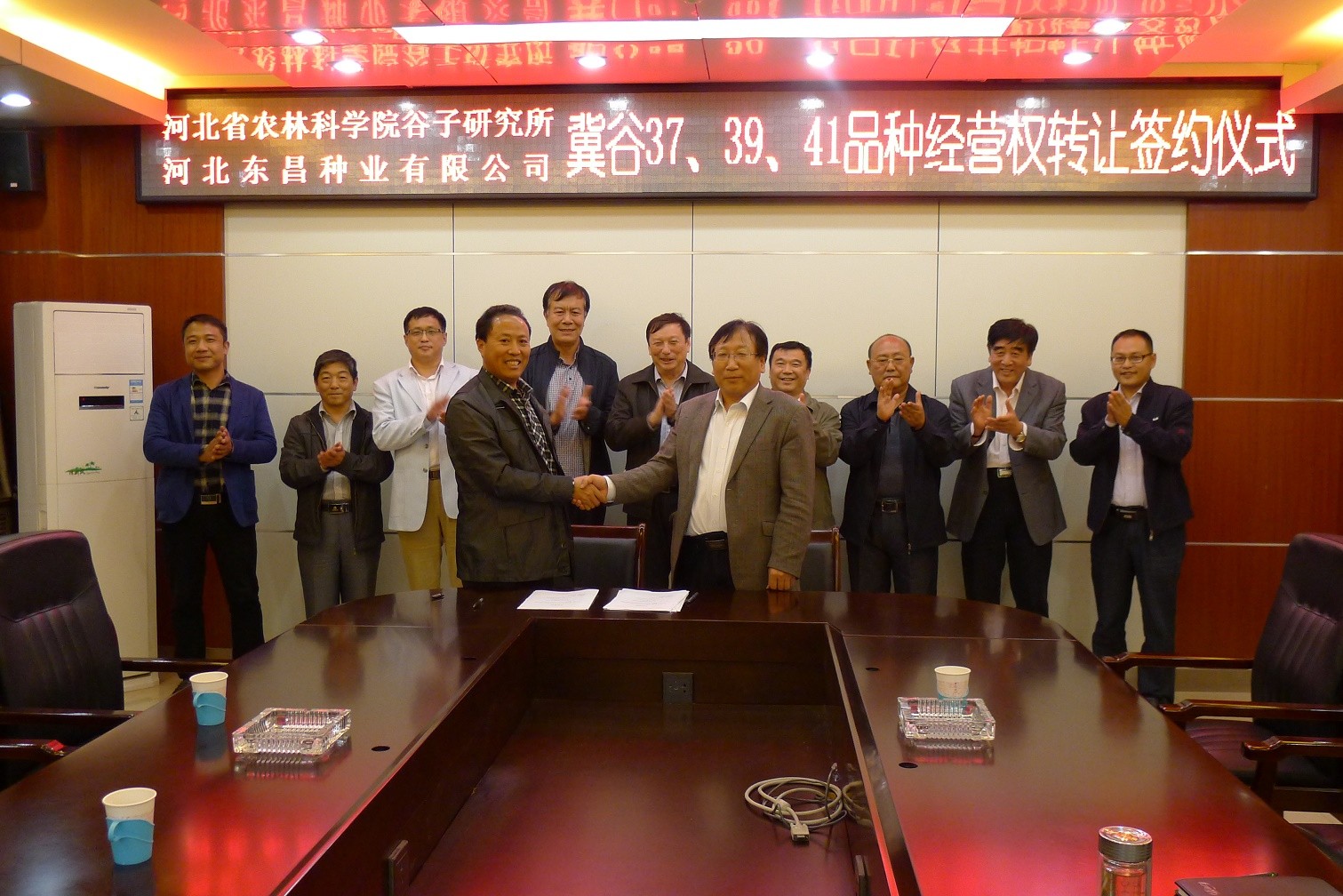 本次转让的三个谷子新品种均为抗除草剂谷子品种,加上去年转让的冀谷38,使河北东昌种业实现了抗除草剂、优质、多抗、适合不同区域和不同种植模式谷子品种系列化,为东昌种业开拓全国市场奠定了坚实基础。至此,谷子所近两年共实现品种权转让和科技服务成果转化达到15项,累计转化收益254.4万元。本次品种经营权转让是在全国科技创新大会和河北省科技创新大会召开后签约的,是谷子所落实科技创新大会,加强科技成果转化的有益探索,标志着谷子所科技成果转化工作迈入新阶段。